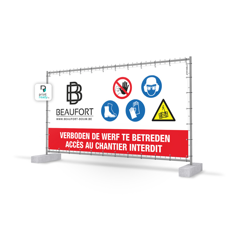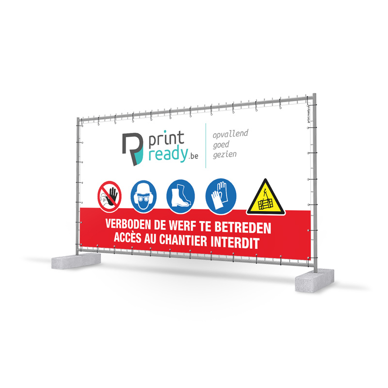 Veiligheid op de bouw werf is essentieel. Daarom kan je eenvoudig werfdoeken bestellen met veiligheidspictogrammen die steeds van toepassing zijn zoals het pictogram Verboden toegang / Niet betreden, draag altijd een veiligheidshelm, oorbescherming, een veiligheidsbril, veiligheidsschoenen en werkhandschoenen en kijk goed uit voor hangende lasten.
