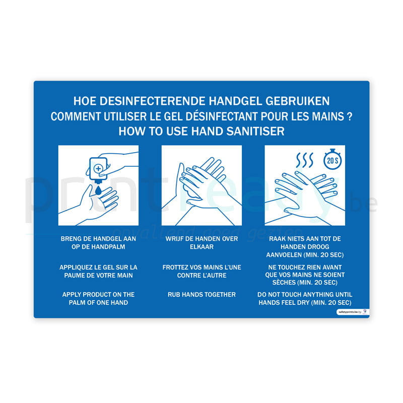 Wil je klanten of werknemers duidelijk informeren over veiligheidsmaatregelen dan kan je veiligheid posters bestellen, zoals deze al dan niet zelfklevende poster met instructies in drie talen “Hoe desinfecterende handgel gebruiken? / Comment utiliser le gel désinfectant pour les mains? / How to use hand sanitiser”, ter preventie van het corona covid-19 virus.
